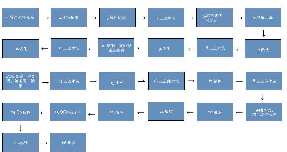 精密電鍍金(厚金、薄金);化學(xué)金;鍍銀(厚銀、薄銀);鍍銅(酸銅、堿銅、焦銅);化學(xué)沉鎳(中磷、高磷);電鍍鎳(可焊性鎳);亮鎳、啞鎳、半光鎳、氨基磺酸鎳);高溫鍍錫(啞錫、亮錫);化學(xué)沉錫;清洗鈍化;專業(yè)電鍍盲孔、深孔等高難度產(chǎn)品,產(chǎn)品廣泛應(yīng)用于通訊電子、航空航天、汽車制造業(yè)等領(lǐng)域。滾鍍生產(chǎn)工藝流程圖